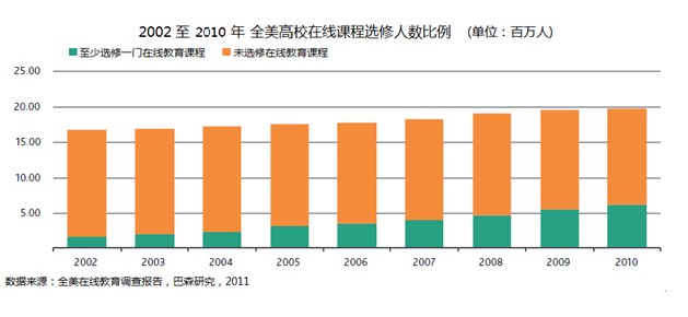 正如《慕課雜談》前幾期所談到的,慕課并不是一個(gè)完全嶄新的概念,就美國(guó)而言,伴隨著20世紀(jì)末開始的營(yíng)利性教育公司上市大潮,商業(yè)在線教育服務(wù)也應(yīng)運(yùn)而生,無(wú)奈學(xué)生準(zhǔn)入門欄、課程質(zhì)量控制、學(xué)費(fèi)貸款及就業(yè)前景等諸多因素影響,公眾似乎對(duì)在線教育產(chǎn)品并不買賬。伴隨著信息技術(shù)迅猛前行,在線教育也得到了進(jìn)一步發(fā)展,人們對(duì)于線上課程的態(tài)度也不像過去那樣冷若冰霜,根據(jù)巴森研究2011年發(fā)表的一份調(diào)查報(bào)告顯示,2003年,只有10%的大學(xué)生選修過在線課程,而短短七年后,這一數(shù)字增長(zhǎng)了約兩倍,截至2010年秋季學(xué)期,全美高校近三成學(xué)生選修了至少一門在線課程,加之近年來哈佛、麻省理工等名校對(duì)在線項(xiàng)目投入的不斷增加,陸續(xù)推出了一系列深受好評(píng)的慕課產(chǎn)品,某種意義上講,名校戰(zhàn)團(tuán)的加入也為在線教育這一飽受爭(zhēng)議的教學(xué)模式增加了權(quán)威背書,這也無(wú)疑會(huì)為在線教育推廣帶來更多利好。