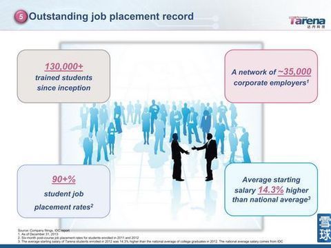 2009年教育部的數(shù)據(jù)顯示,當年高校IT相關(guān)專業(yè)招生人數(shù)大約40萬(含211~大專)。我們假設2013年這些人畢業(yè)時有60%共24萬個專業(yè)對口的崗位能提供給他們(由于廣大的大專和三本的存在,實際上不可能這么高),同年達內(nèi)招股書上的數(shù)據(jù)是學員總?cè)藬?shù)4萬多。那么我們保守的預估一下,每年新增面向應屆畢業(yè)生的崗位中15%~20%是被達內(nèi)的學生所占據(jù)的,再刨除6萬的211大學生(15%),剩下的30萬的人在爭奪剩下14萬個的崗位。2013年是就業(yè)最難年,大量動用關(guān)系網(wǎng)找工作的人,使剩下的自由競爭變得更加激烈。競爭越激烈,達內(nèi)培訓的學員就更容易量化培訓的結(jié)果,達內(nèi)的品牌強度就更大。壟斷了人才的出口,使得達內(nèi)的招生變得更有可持續(xù)性。