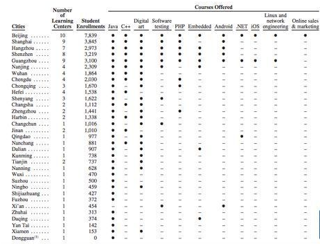 我們?cè)賮?lái)看這張圖的縱向第三列(依然是Ricky君提供),我們可以看到數(shù)字藝術(shù)所覆蓋的城市已經(jīng)接近20個(gè)。僅2013年一年時(shí)間里,數(shù)字藝術(shù)線的分布居然超過(guò)除了java以外的全部老課程線。