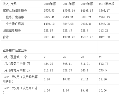 先看全通的發(fā)展史,公司2006年推出的廣東省家?;悠脚_,在國內(nèi)起步最早。積淀了系統(tǒng)深度運維的支撐體系,具備電信級的系統(tǒng)處理能力,自主開發(fā)100 多個功能模塊,組合形成不同功能性系統(tǒng),未來有望根據(jù)用戶的角色,按需定制服務(wù)。公司打開地方學(xué)校市場的方式是從對老師提供IT培訓(xùn)開始,切入了學(xué)校的辦公平臺,使用群體是40-50歲年齡段的老師,然后完善了學(xué)校的信息系統(tǒng)。有了先發(fā)優(yōu)勢,公司才借助移動通信切入了校訊通領(lǐng)域,成了SP。公司家校互動信息服務(wù)已覆蓋了廣東、廣西、湖南、湖北、安徽、云南、浙江、福建、貴州9省區(qū)。截至2013年11月末,公司業(yè)務(wù)推廣運營的服務(wù)人員超過560名,覆蓋學(xué)校近7,900所,覆蓋用戶數(shù)569.60萬人;系統(tǒng)開發(fā)運維覆蓋用戶超過2,500萬(注2),覆蓋學(xué)校超過44,000所。這些資源都是公司一家家學(xué)校攻下來的,如果微信等也要介入這個市場勢必也要一家家的搶占,而這種搶占對學(xué)校來說是資源浪費。因此,對學(xué)校里學(xué)生信息數(shù)據(jù)的獨占性和家長的粘性是全通教育的價值點。