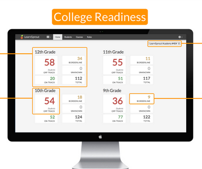 LearnSprout最新公布的“大學(xué)升學(xué)準(zhǔn)備儀表盤”功能,服務(wù)于高中輔導(dǎo)員,讓他們能以簡便、直觀的工具監(jiān)控學(xué)生的大學(xué)升學(xué)準(zhǔn)備情況。分析學(xué)生升學(xué)準(zhǔn)備情況的數(shù)據(jù)當(dāng)然來源于學(xué)生信息系統(tǒng),這項(xiàng)功能要分析的數(shù)據(jù)有GPA(平均成績點(diǎn)數(shù))、出勤記錄,考試成績等。