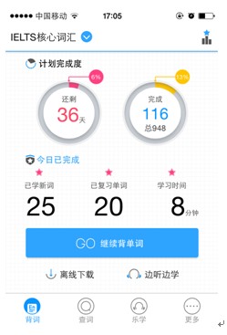 如圖,整體學(xué)習(xí)過(guò)程上,樂(lè)詞相比市場(chǎng)其它產(chǎn)品并無(wú)太大差異,涵蓋最基本的學(xué)、練、復(fù)習(xí)三步。每天的學(xué)習(xí)量按照學(xué)習(xí)計(jì)劃分配,開(kāi)始學(xué)習(xí)時(shí)首先進(jìn)入分組單詞學(xué)習(xí),每組10個(gè)左右單詞,學(xué)習(xí)完成后進(jìn)入測(cè)試練習(xí)階段,出錯(cuò)后再次學(xué)習(xí),直至復(fù)習(xí)完成。支持離線學(xué)習(xí)在線同步數(shù)據(jù),不過(guò)目前語(yǔ)音包只能下載單詞詳解頁(yè)面,無(wú)法觀看視頻。