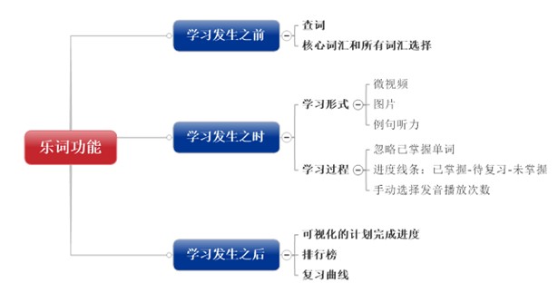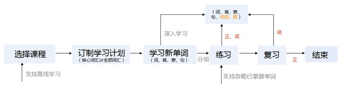 如上圖,用戶學(xué)習(xí)發(fā)生之前,可以按照個(gè)人需求程度,選擇核心詞匯和所有詞匯內(nèi)容,此外也提供查詞功能便于學(xué)習(xí)者日常使用,直接反饋該詞在詞庫(kù)中的內(nèi)容,包括意、音、例、圖、視頻等;學(xué)習(xí)過(guò)程中,從學(xué)習(xí)到練習(xí),涵蓋了進(jìn)度、忽略已掌握單詞、視頻、邊走邊聽(tīng)等功能;學(xué)習(xí)完成后,還以可視化的形式顯示每個(gè)用戶的學(xué)習(xí)情況,并利用記憶曲線及時(shí)復(fù)習(xí)。