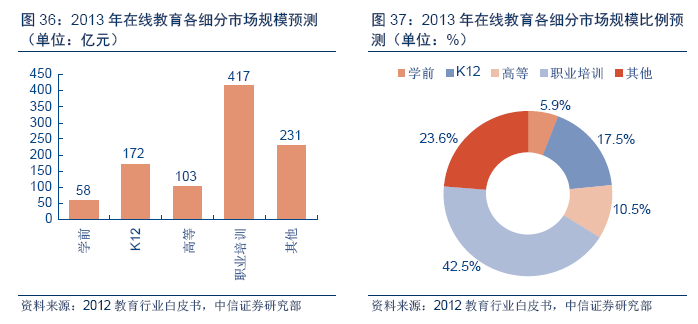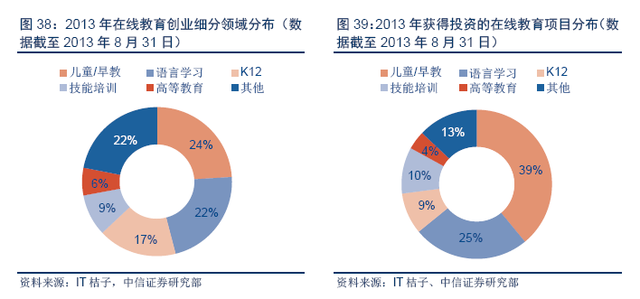 另外值得一提的是近幾年如火如荼的互聯(lián)網(wǎng)(在線)教育。2013年,學(xué)前和K12的互聯(lián)網(wǎng)教育規(guī)模分別為58億和172億元。創(chuàng)投市場也體現(xiàn)出同樣趨勢,2013年前8個月中,國內(nèi)在線教育投資項目多集中于學(xué)前教育、語言培訓(xùn)和職業(yè)技能培訓(xùn)。根據(jù)《2013年在線教育創(chuàng)業(yè)投資報告》截至2013年8月31日的數(shù)據(jù),兒童/早教類的創(chuàng)業(yè)項目占比24%,語言學(xué)習(xí)占比22%。在移動APP大潮中,早教類項目也吸引了投資人的眼光,在同期獲得投資的在線教育項目中,兒童/早教領(lǐng)域的有27家,占比39%,語言學(xué)習(xí)類占比25%。
