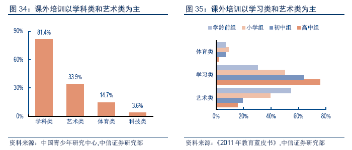 學(xué)前教育最核心的便是幼兒園,在《中國兒童發(fā)展綱要(2011—2020年)》中,“學(xué)前三年毛入園率達到70%,學(xué)前一年毛入園率達到95%”已被納入目標規(guī)劃。除此外,主要包括課外培訓(xùn)或輔導(dǎo)方面,這部分支出主要集中于學(xué)科類和藝術(shù)類培訓(xùn)。81.4%的家庭對于課外培訓(xùn)或輔導(dǎo)的選擇在于語文、數(shù)學(xué)、外語等學(xué)科類輔導(dǎo);33.9%的家庭支付于音樂、舞蹈、繪畫、書法等藝術(shù)類培訓(xùn);14.7%的家庭支付于武術(shù)、游泳等體育類訓(xùn)練;另有3.6%的家庭讓孩子參與航模、機器人等科技類培訓(xùn)。