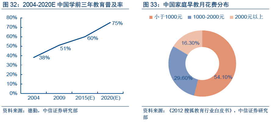 得益于近年來一二線城市人均收入的提高及家長對于子女教育的重視,單位家庭對學(xué)前教育的投入越發(fā)提高。我們估算學(xué)前教育市場要占整體嬰童教育市場一半左右,即1000億元水平。而《2012搜狐教育行業(yè)白皮書》調(diào)查顯示:有29.6%的家庭每月投資在孩子早期教育上的費用為1000-2000元,投入2000元以上的家庭比例為16.3%。