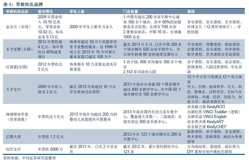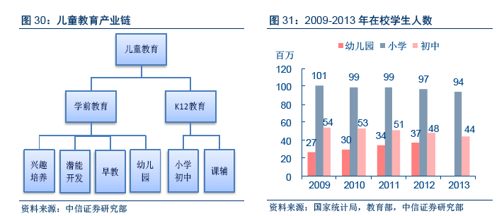 嬰童教育產(chǎn)業(yè)主要包括學(xué)前教育和K12(小學(xué)、初中和高中)教育中的小學(xué)和初中部分,以及由此衍生的出版、增值服務(wù)等。學(xué)前教育以兒童興趣培養(yǎng)、潛能開發(fā)、英語早教、幼兒園等形式為主;K12教育除常規(guī)義務(wù)教育之外,則主要以課輔為主。按中童研測算,2013年嬰童教育市場規(guī)模達到2130億元。