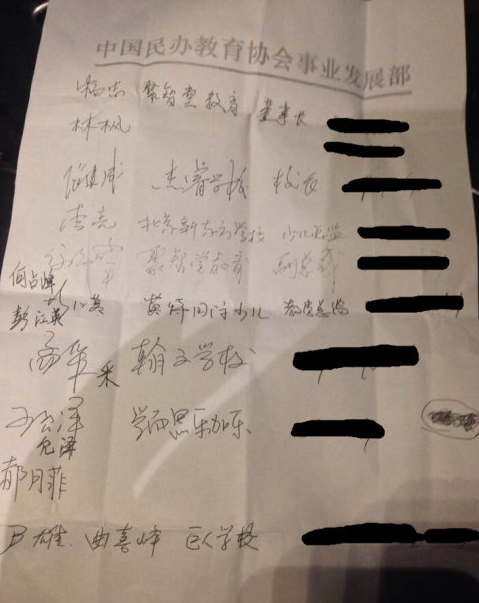 英特少兒英語董事長曲威的失聯(lián)后,繳納了數(shù)萬元學費的1500多名學員及家長無處保障自己權益,為了維護民辦教育行業(yè)的聲譽,在中國民辦教育協(xié)會的邀請下,聚智堂董事長楊志先生和副總裁何占峰先生參加了英特緊急援助的會議,共同協(xié)商對策,并大致了解了事情的來龍去脈。下圖為當時參會的簽到表: