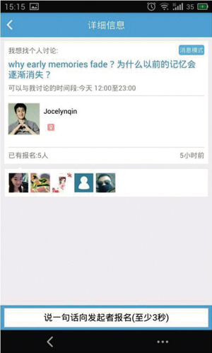 據(jù)英語說官網(wǎng)介紹,“英語說”是女媧網(wǎng)絡(luò)公司旗下的產(chǎn)品,定位語音聊天練英語,希望建立一個(gè)在線“英語角”的社區(qū),鼓勵(lì)大家要把英語說出口。除了匹配話題,還可以邊學(xué)習(xí)邊交好友。英語說成立于2014年1月,目前只推出了Android版,iOS版尚未上線。