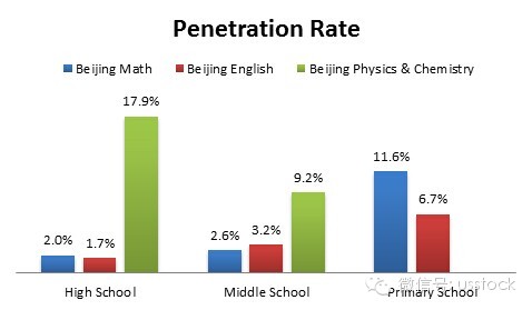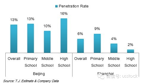 雖然初中高中的入學(xué)人數(shù)較少,但我們從滲透率的角度觀察發(fā)現(xiàn),在市場(chǎng)已經(jīng)成熟的北京,好未來(lái)各階段滲透率最高的是高中。上海由于進(jìn)入時(shí)間還不夠長(zhǎng),滲透率遠(yuǎn)遠(yuǎn)低于北京。