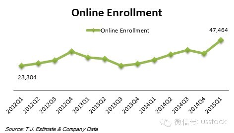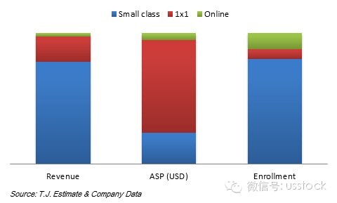 課外輔導(dǎo)的機(jī)構(gòu)很多,模式也都不一樣,而好未來(lái)主要是專注于小班教學(xué)模式的。從下圖可以看出,小班收入占了整體收入的絕大部分,1對(duì)1和在線教育起補(bǔ)充作用。