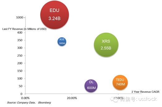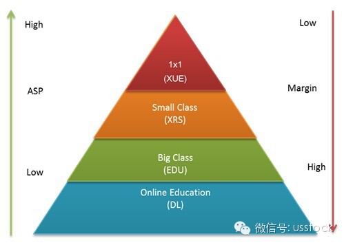 目前國(guó)內(nèi)上市的其他幾家教育公司里面,學(xué)大(XUE)是專注1對(duì)1教育的,新東方(EDU)和正保遠(yuǎn)程教育(DL)則分別是大班模式和在線教育的典范。注意下圖。金字塔越頂端的客單價(jià)越高,決定了市場(chǎng)規(guī)模越小,且利潤(rùn)率越低。