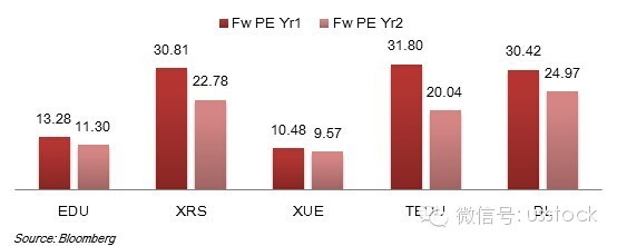 從動(dòng)態(tài)估值角度看,好未來(lái)還是相對(duì)比較貴的,估值水平已經(jīng)接近純線上教育公司正保。但相對(duì)于其強(qiáng)勁的增長(zhǎng)動(dòng)力和市場(chǎng)空間。我們認(rèn)為目前估值水平還是較為合理的。歷史估值區(qū)間在18-31倍Forwad PE。目前PE為歷史的估值高點(diǎn)。按16年EPS計(jì)算,對(duì)應(yīng)的股價(jià)范圍是$20-$33.目前股價(jià)$32.8。