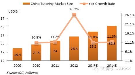 下圖:IDC和Jefferies估計(jì)的中國(guó)課外輔導(dǎo)市場(chǎng)規(guī)模