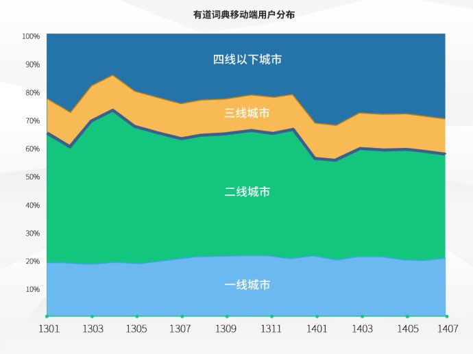 我簡單地以有道詞典用戶為例。在過去一年多時間里,即便一線、二線城市用戶的總量上還是占到多半,但比例在縮小,三線、以及以下的城市的比例在增加。也就是說,一二線省會以以上城市略占優(yōu)勢,但三四線城市是非常大的增量市場。