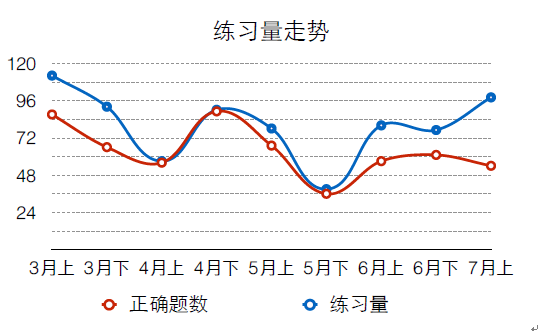 第二,有效地學(xué)生的學(xué)習(xí)情況進(jìn)行統(tǒng)計(jì)和分析,了解學(xué)生知識(shí)點(diǎn)和能力兩個(gè)模塊各個(gè)維度的血情況。比如,我們通過對(duì)學(xué)生聯(lián)系量和題目正確率進(jìn)行分析,就可以看出學(xué)生階段性的學(xué)習(xí)情況。如圖所示,在4月下,聯(lián)系量和正確題目數(shù)量都在迅速上升,說明這個(gè)階段學(xué)生比較用功,訓(xùn)練相對(duì)有效。而在7月上,雖然練習(xí)量有所增加,但是正確題目數(shù)卻出現(xiàn)了下降趨勢(shì),說明訓(xùn)練是有問題的,沒有針對(duì)學(xué)員的問題進(jìn)行有效的練習(xí),就需要老師對(duì)題目、訓(xùn)練重點(diǎn)等進(jìn)行適度的分析和調(diào)整。