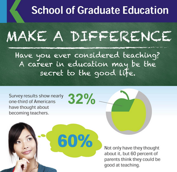 2013年12月,市場(chǎng)調(diào)查機(jī)構(gòu)哈里斯互動(dòng)(Harris Interactive)代表卡普蘭大學(xué)研究生教育學(xué)院做的調(diào)查表明,32%的美國(guó)人曾經(jīng)考慮過(guò)從事教學(xué)工作。根據(jù)美國(guó)勞工統(tǒng)計(jì)局(Bureau of Labor Statistics)的數(shù)據(jù)表明,到2022年,美國(guó)預(yù)計(jì)會(huì)涌現(xiàn)出超過(guò)100萬(wàn)個(gè)中小學(xué)及大專教育方面的新職位,而且這些職位都是在市場(chǎng)已有基礎(chǔ)之上增加出來(lái)的。此外,這些數(shù)據(jù)還表明美國(guó)將會(huì)新增大約9.08萬(wàn)個(gè)課堂之外的教育相關(guān)職位,包括行政管理和咨詢職位,等等。