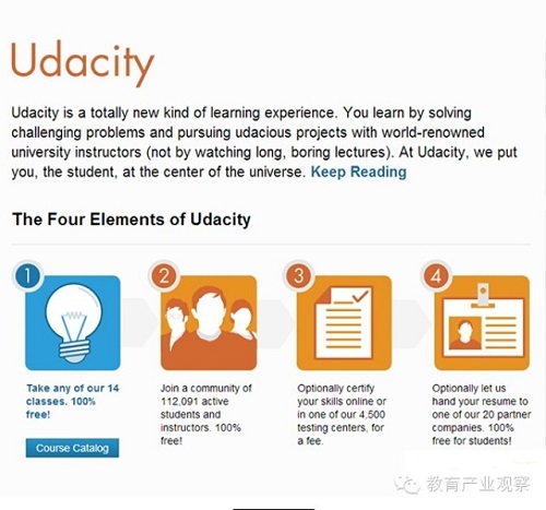 據(jù)了解,作為一個(gè)營(yíng)利性平臺(tái),Udacity并未實(shí)現(xiàn)盈利,與另外兩大MOOC巨頭一樣,此前Udacity上的所有課程均免費(fèi),如果想要獲得證書(shū)認(rèn)證則需要收費(fèi)。不過(guò),Udacity在2013年經(jīng)歷了一次轉(zhuǎn)型,免費(fèi)課堂的模式將不再運(yùn)營(yíng),開(kāi)始出售在線培訓(xùn)課程,同時(shí)將重心轉(zhuǎn)移到IT科技領(lǐng)域的在線培訓(xùn)上。不同于edX和Coursera在加速進(jìn)軍中國(guó)市場(chǎng),目前Udacity尚未與中國(guó)高校進(jìn)行合作。