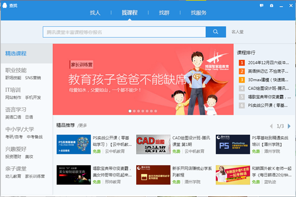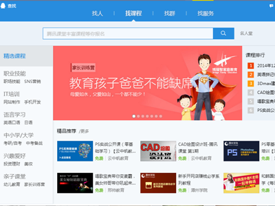 多知網(wǎng)體驗發(fā)現(xiàn),從“找課程”搜索并點擊某門課程,將會直接進入騰訊課堂界面。另外,在QQ主面板上,也加入了騰訊課堂的搜索入口。
