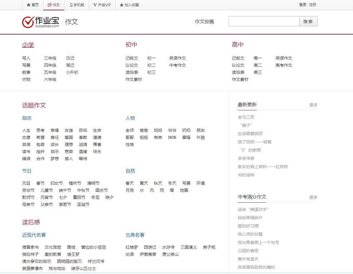 答疑網(wǎng)站作業(yè)寶上線新版塊“作文”,為學(xué)生提供寫作文時需要的素材。作業(yè)寶將“作文”板塊涵蓋了從小學(xué)到高中各個年級。文體包括記敘文、議論文、讀后感等。用戶可以根據(jù)年級、話題進(jìn)行查找,也可以在右上角直接搜索。