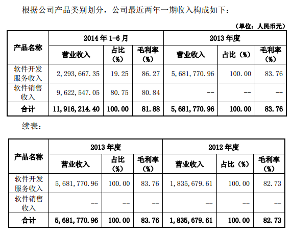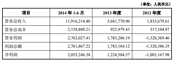 公告披露,2014年1-6 月、2013 年、2012 年,公司經(jīng)審計的營業(yè)收入分別為1191萬元、568萬元、183萬元;凈利潤分別為203萬元、122萬元、-108萬元。