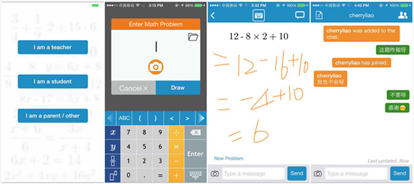MathChat是一款結(jié)合即時(shí)通訊和電子白板的答疑類(lèi)產(chǎn)品,允許學(xué)生之間,教師和學(xué)生之間,甚至于家長(zhǎng)與孩子之間的答疑。當(dāng)你登錄 MathChat,你可以選擇自己的身份:家長(zhǎng)、老師和學(xué)生,之后可以通過(guò)你的通訊錄邀請(qǐng)你的好友加入,當(dāng)然如果你選擇用 Facebook 賬戶(hù),那么你就可以連接到 Facebook 好友。
