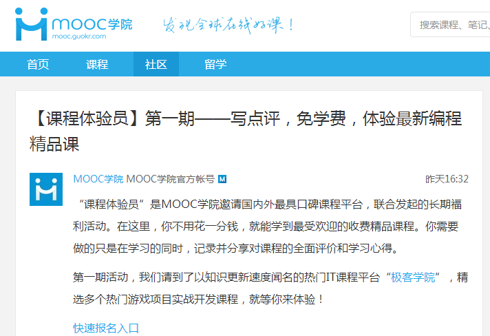 MOOC學(xué)院將通過“課程體驗員”的選拔活動,邀請MOOC學(xué)院社區(qū)內(nèi)的活躍用戶免費體驗極客學(xué)院平臺上的熱門收費課程,并撰寫學(xué)習(xí)點評,為更多學(xué)習(xí)者提供參考信息。