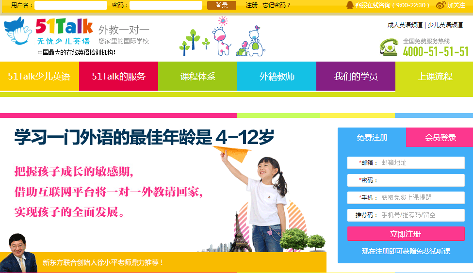 51Talk少兒英語已經(jīng)上線,據(jù)網(wǎng)站上的宣傳來看,無憂少兒英語是針對(duì)4—12歲年齡段的青少年推出的專屬的課程體系。