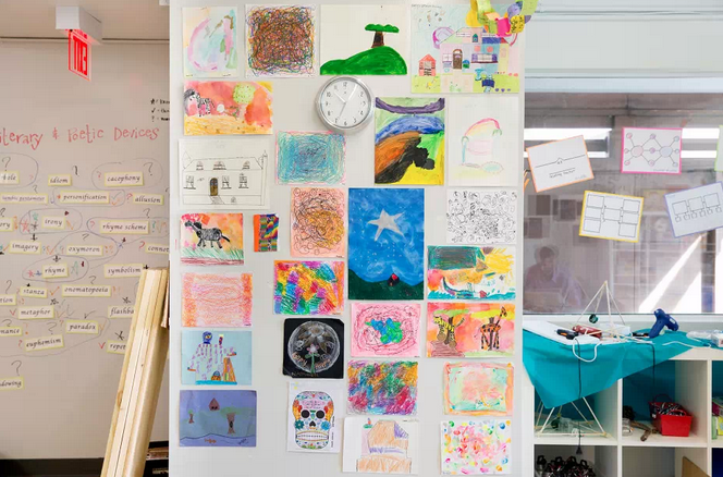 孩子們的藝術作業(yè)被貼在墻上做裝飾