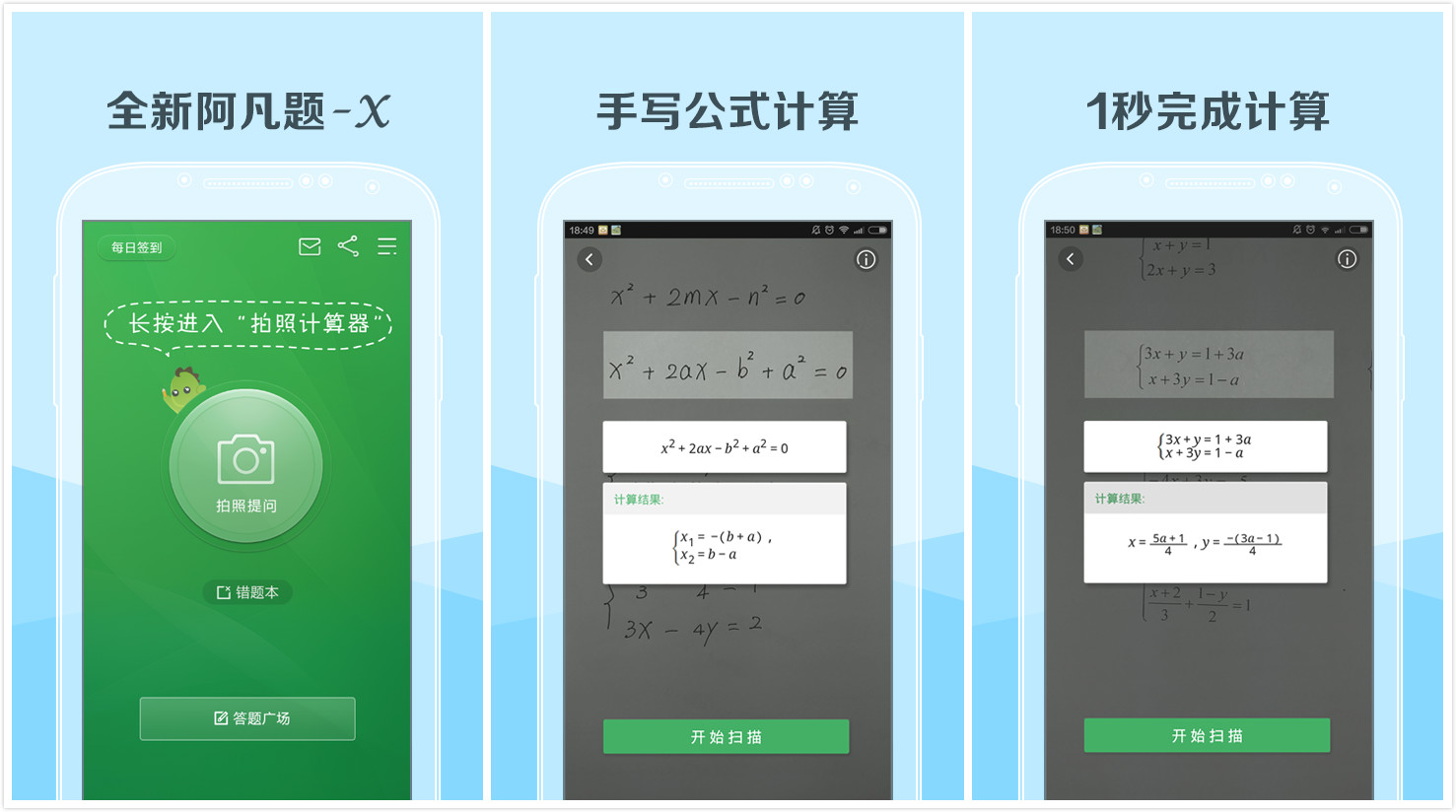 阿凡題是專注K12領(lǐng)域的拍照答題類App,用戶拍下題目并上傳,幾秒鐘之內(nèi)服務(wù)器就能從題庫中搜到解題步驟和答案,國內(nèi)同類產(chǎn)品還有學(xué)霸君、學(xué)習(xí)寶、小猿搜題等。新發(fā)布的阿凡題-X則將自己定義為一款“拍照計(jì)算器App”(國外同類產(chǎn)品還有Myscript和Photomath),支持手寫公式識別,可以完成加減乘除的基本運(yùn)算、解一元一次方程、一元二次方程和二元一次方程組。這意味著,用戶可以用阿凡題-X拍攝以上方程的任何變形,無論手寫體還是印刷體,應(yīng)用都可以在1秒鐘左右給出解題步驟和答案。“阿凡題-X”今天作為一款獨(dú)立App在應(yīng)用商店上線,但其功能也會被嵌入原搜題App“阿凡題學(xué)習(xí)神器“中。