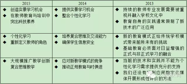 2013-2015年《地平線報(bào)告》中阻礙K-12領(lǐng)域技術(shù)應(yīng)用的6大關(guān)鍵趨勢(shì)
