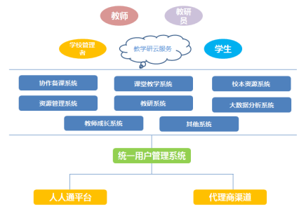 上圖中的人人通平臺(tái),是面向?qū)W校管理者、教師、學(xué)生的日常教學(xué)、教研提供資源和 APP應(yīng)用服務(wù),中小學(xué)校之間可進(jìn)行校際互動(dòng)、教學(xué)互動(dòng)、教師學(xué)生互動(dòng)。
