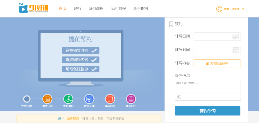 學(xué)生在91好課下單前,有一個(gè)課前預(yù)測環(huán)節(jié)。預(yù)測題目就是5道與學(xué)生疑問相關(guān)的題目,做完之后下單。所有老師通過搶單的方式獲取訂單。獲得訂單的老師會打電話給學(xué)生仔細(xì)了解學(xué)生的弱項(xiàng),再根據(jù)學(xué)生弱項(xiàng)去備課。最后老師通過直播的方式上課。目前91好課也上線了系列課程。