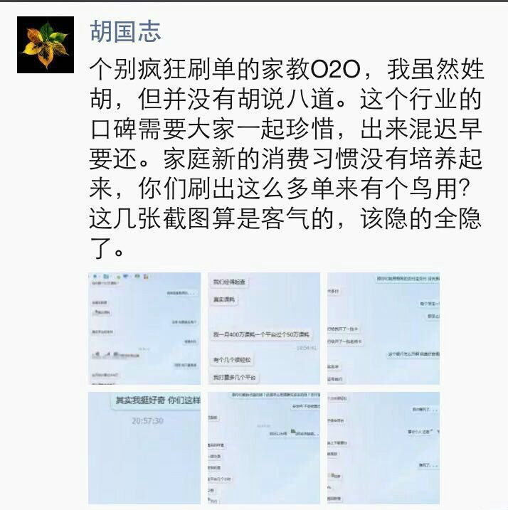 多知網(wǎng)8月28日消息,日前輕輕家教創(chuàng)始人胡國志在朋友圈曬出截圖,爆出與某操作刷單的服務(wù)商的聊天記錄,該服務(wù)商表示,在某家教O2O刷單,可以拿到30%補(bǔ)貼。