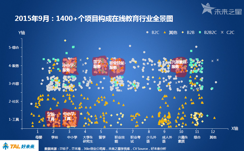 按照客戶需求劃分,在線教育的創(chuàng)業(yè)項(xiàng)目主要涉及11大領(lǐng)域,分別是母嬰、學(xué)前、少兒外語、中小學(xué)、大學(xué)/研究生、留學(xué)、職業(yè)考試、職業(yè)技能、成人外語、興趣/素質(zhì)、綜合,將這11個(gè)標(biāo)簽設(shè)定為在線教育的“X軸”。按主營業(yè)態(tài)劃分,可以分為工具、社區(qū)、內(nèi)容、服務(wù)共4個(gè)領(lǐng)域,設(shè)定為在線教育的“Y軸”。按商業(yè)模式劃分,可以分為B2B、B2C、B2B2C、C2C、C2B五種模式,設(shè)定為在線教育的“Z軸”。由此,搭建出中國在線教育的行業(yè)圖譜坐標(biāo)系,可令中國在線教育所有項(xiàng)目“對號入座”。