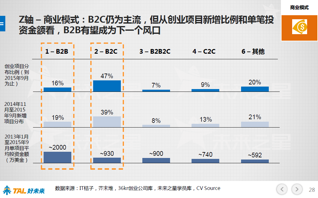 相關(guān)數(shù)據(jù)也顯示,雖然B2C 現(xiàn)在仍是主流(截止至2015年9月,B2C項(xiàng)目占所有項(xiàng)目的47%),但從單筆投入和近一年來的新增項(xiàng)目比例來說, B2B開始發(fā)力。從2014年底以來的B2C類新增項(xiàng)目占所有新增項(xiàng)目的39%,單筆投資金額在930萬美金;而對于B2B來說,從2014年底以來的新增項(xiàng)目占所有新增項(xiàng)目的19%,單筆金額在2000萬美金,單項(xiàng)目投資金額遠(yuǎn)超B2C。