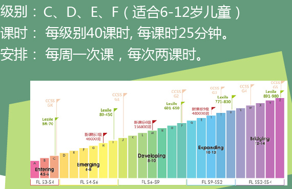 據(jù)介紹,這套在線閱讀課程內(nèi)容包括10本精讀本+10本流利度讀本+10本泛讀本,共1000冊原版英文讀本,適合6-12歲兒童。這些讀本內(nèi)容分為四個(gè)級別,與美國小學(xué)同步,每級別40個(gè)課時(shí),每課時(shí)25分鐘,每周一次課,每次兩個(gè)課時(shí)。