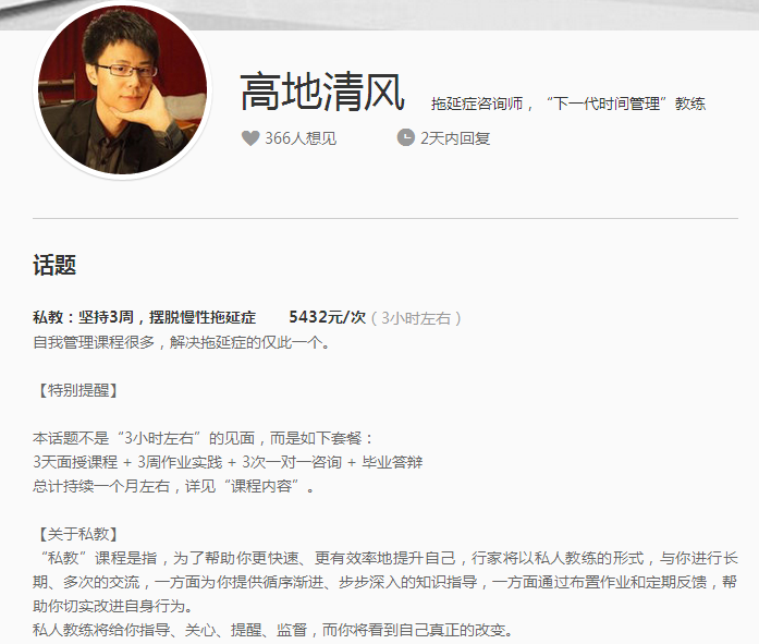 而拖延癥咨詢師高地清風(fēng)的私教課 《堅持3周,擺脫慢性拖延癥》設(shè)計的更為系統(tǒng)。這門課價格為5432元/次。課程設(shè)置為3天面授課程 + 3周作業(yè)實踐 + 3次一對一咨詢 + 畢業(yè)答辯,學(xué)習(xí)時間總計持續(xù)一個月左右。