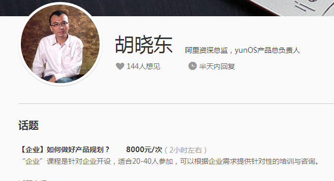 除了針對個人的私教課外,在行也推出了針對企業(yè)的培訓(xùn)課程。如阿里資深總監(jiān)胡曉東的《如何做好產(chǎn)品規(guī)劃》,課程售價8000元/次。這門課程是針對企業(yè)開設(shè),適合20-40人參加,可以根據(jù)企業(yè)需求提供針對性的培訓(xùn)與咨詢。