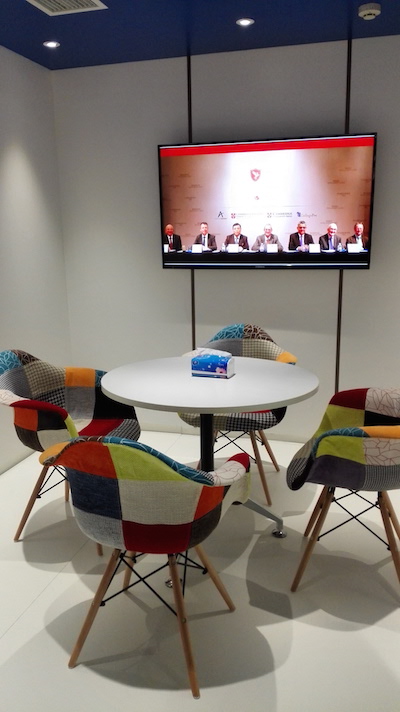 會后,劍橋ClassServer LLP教材出版專家Tim Gifford展示了劍盟雅思預備學院的上課方式,通過ClassServer,教師用觸控筆和iPad控制教室內的四塊白板的顯示內容,分別可以顯示課本、視頻、學生的題目提交情況、學生的作業(yè)和測試完成情況,并隨時通過觸控筆將屏幕變成白板進行板書。通過自己的iPad教師端,教師還能實時控制學生端的操作,進行鎖定屏幕、點對點或點對群租發(fā)送練習題,作業(yè)等動作。
