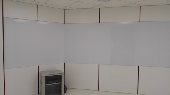 教室內景圖,圖中白板上課時通過投影即變成屏幕或白板