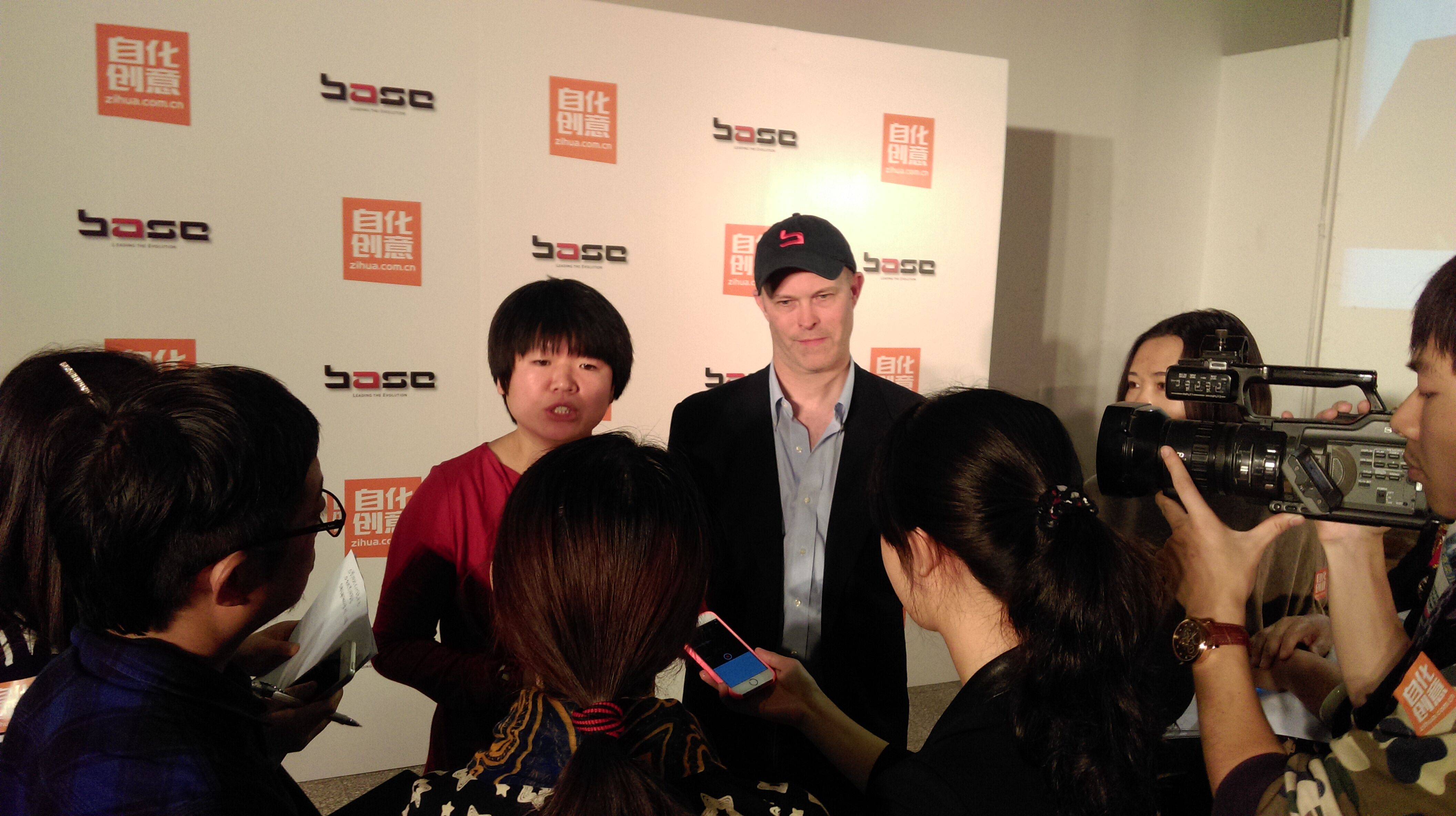 圖為自化創(chuàng)意CEO孫遠(yuǎn)(左)與Base FX CEO Christopher Bremble(右)接受采訪