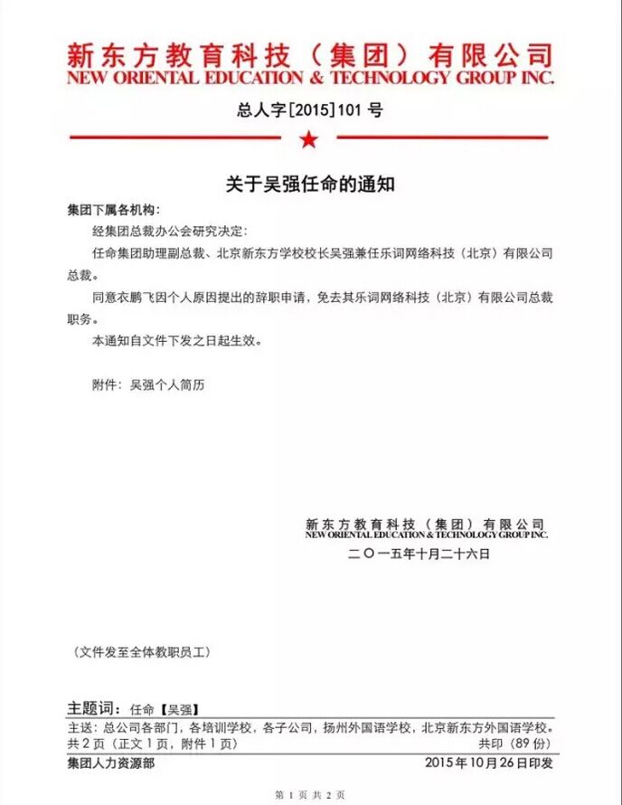 多知網(wǎng)10月26日消息,今日,新東方宣布,新東方集團(tuán)助理副總裁、北京新東方學(xué)校校長吳強(qiáng)兼任樂詞網(wǎng)絡(luò)科技(北京)有限公司總裁。樂詞原總裁衣鵬飛因個人原因離職。