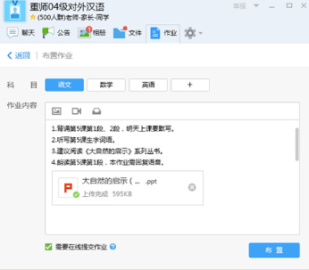 目前,在QQ家校·師生群中,老師可以下發(fā)語音、圖片、視頻、文字等多種形式的作業(yè),家長與學(xué)生用手機(jī)接收到作業(yè),并在線作答提交。QQ家校·師生群有一鍵提醒功能,對于未能按時完成作業(yè)的學(xué)生集中提醒,并且還能一鍵提醒家長查閱。