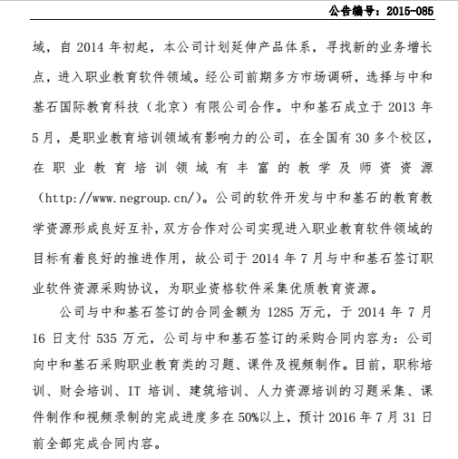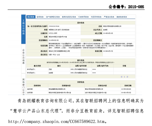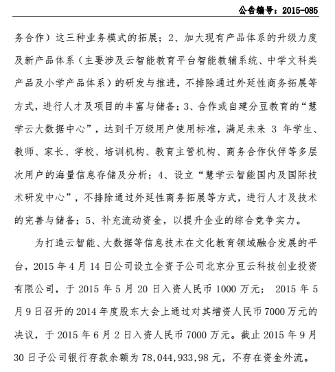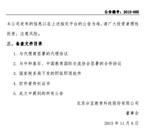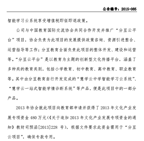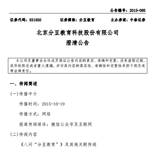 以下為《北京分豆教育科技股份有限公司澄清公告》(編號:2015—085)全文。