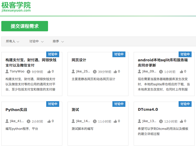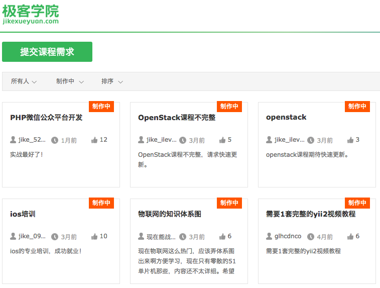 以“需求發(fā)現(xiàn)系統(tǒng)”為例,極客學(xué)院開設(shè)了一個“提交課程需求”頁面,顯示用戶共提交了4471個需求,共5976個投票,這些課程的狀態(tài)有的是“討論中”,有的“制作中”,有的“已上線”。這些需求可以按發(fā)布時間和投票數(shù)量進行排序。
