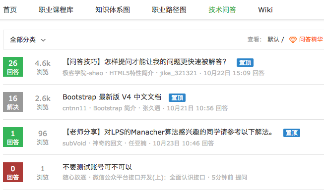 另外,極客學(xué)院開設(shè)了一個“技術(shù)問答”專區(qū),實時解決用戶提出的問題,回答問題的是極客學(xué)院百人規(guī)模的“外腦”團隊,他們多為工作3-5年的一線工程師。官網(wǎng)數(shù)據(jù)顯示,這些問題的解決率是99%。