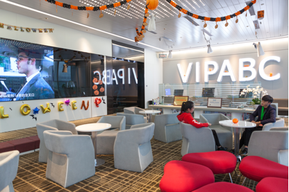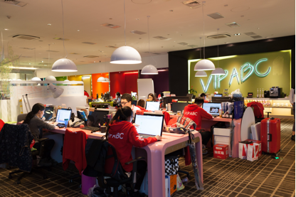VIPABC訪客會(huì)談區(qū),這里有很多椅子和沙發(fā),公司人員與來(lái)訪者在這個(gè)區(qū)域進(jìn)行洽談,大屏幕平時(shí)播放VIPABC宣傳片,到了周五下午,這里則變成一個(gè)大型KTV,員工在這里舉行各種慶?;顒?dòng)。VIPABC每隔一周的周五下午均會(huì)舉行員工團(tuán)建活動(dòng),大家在輕松的氛圍中交流、增進(jìn)團(tuán)隊(duì)感情。