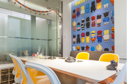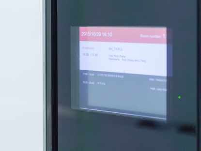 VIPABC會(huì)議室,每一間會(huì)議室以一句英文作為主題,都有不同的主題背景墻,背景墻是設(shè)計(jì)師手繪而成,希望給員工提供輕松的辦公氛圍。每間會(huì)議室的外部小屏幕上會(huì)顯示會(huì)議室的預(yù)約信息,員工若需使用會(huì)議室,只需要通過(guò)系統(tǒng)預(yù)約,預(yù)約完成后,會(huì)議室前的小屏幕上會(huì)實(shí)時(shí)顯示最新顯示預(yù)約信息。