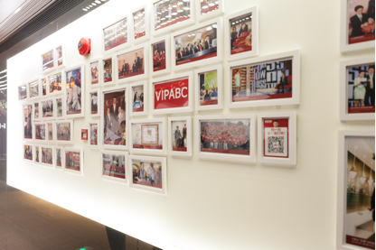 VIPABC公司文化墻,上面有員工團(tuán)建活動(dòng)、員工大會(huì)等活動(dòng)的照片。